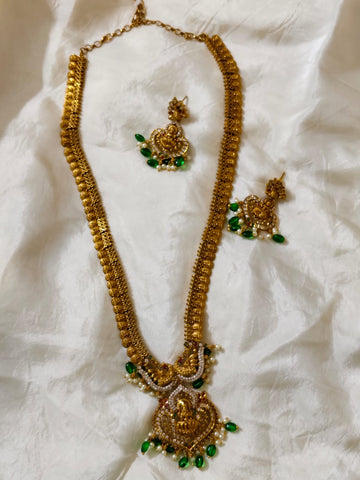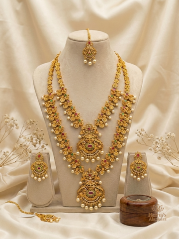Grand creations adorned with sacred motifs and traditional stone settings. Each necklace reflects the splendour of temple architecture and the grace of royal heritage—made for divine celebrations.