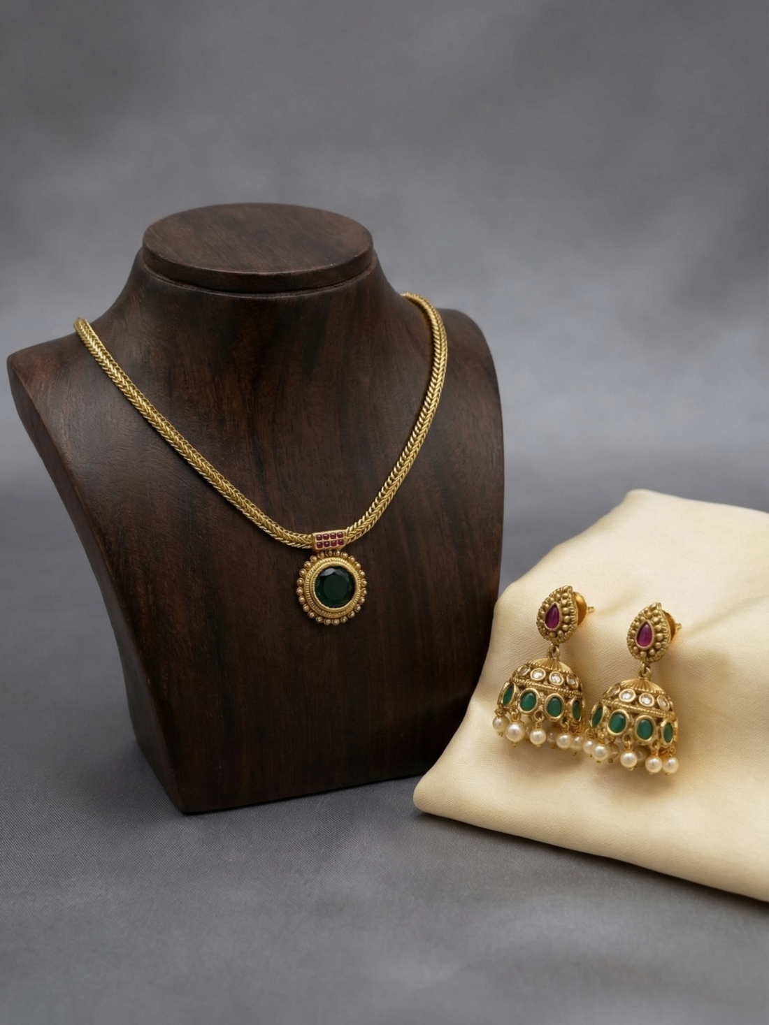 Rooted in traditional South Indian symbolism, the Twin Stone Pendant Chain Set features an intricately crafted...