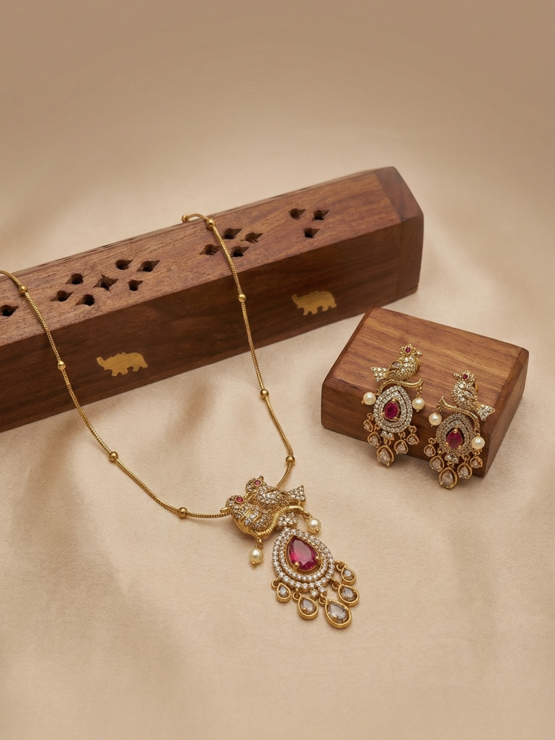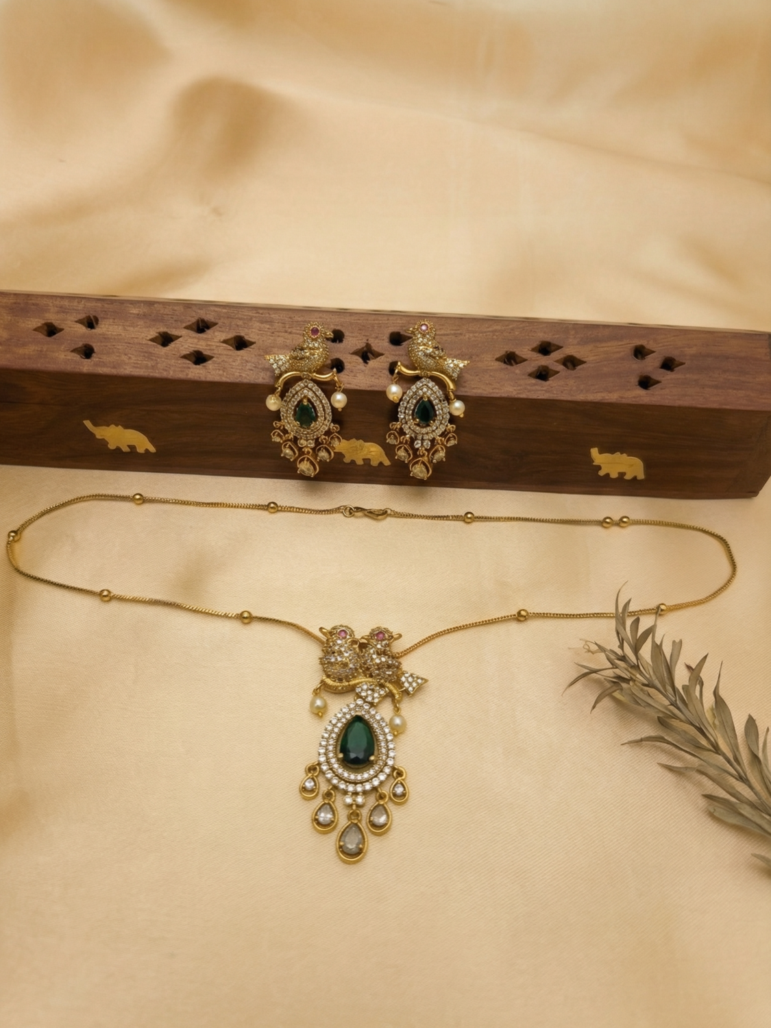 Designed with a sleek gold-toned chain, this piece offers a graceful and lightweight look, perfect for those who prefer subtle yet meaningful jewellery. Paired with matching twin parrot earrings, this set is ideal for festive occasions, poojas, temple visits, and elegant everyday ethnic wear.