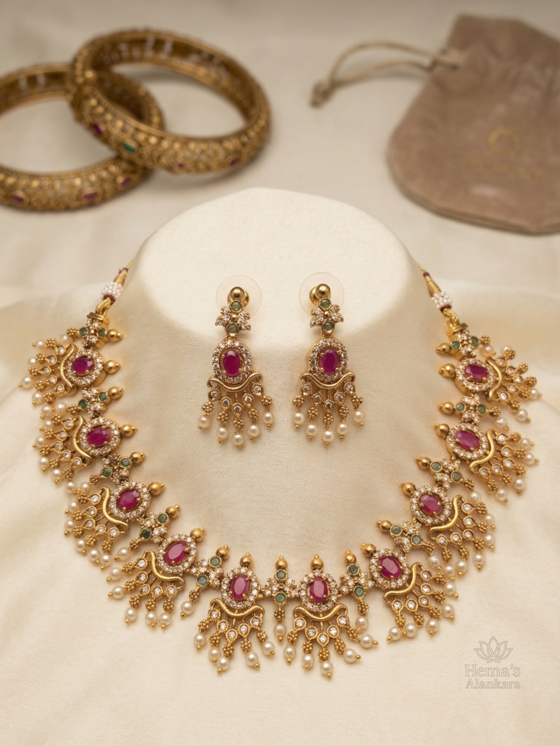 Celebrate timeless elegance with this exquisitely crafted Triratna Pearl Choker Necklace Set, inspired by traditional South Indian jewellery artistry. Designed with a harmonious combination of pink, white, and green stones, this choker reflects classic beauty and festive grandeur.
