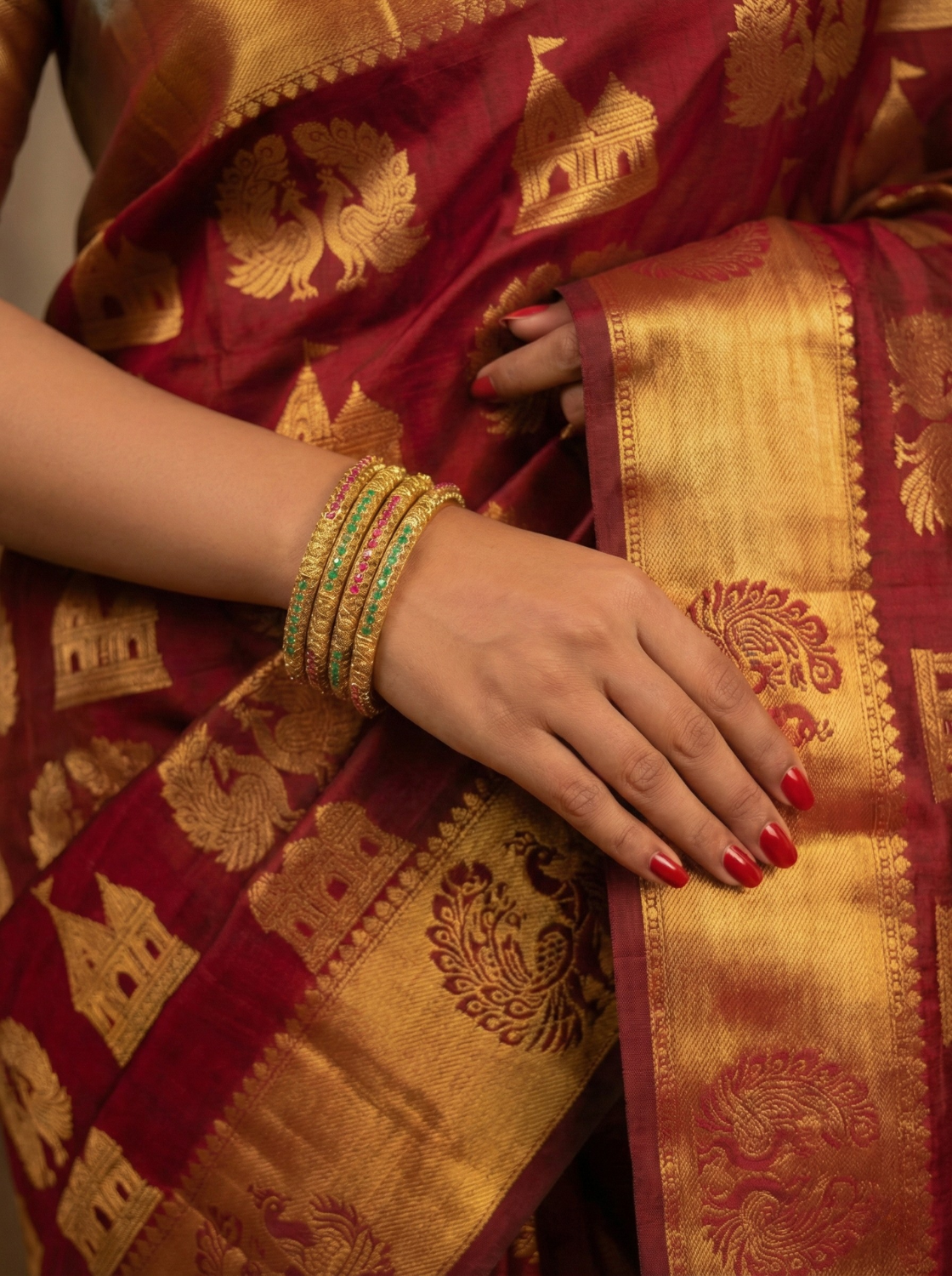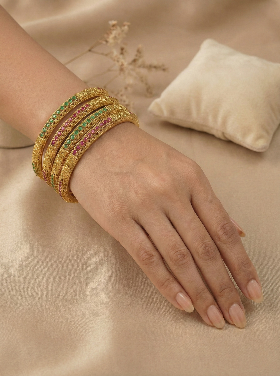 A timeless celebration of heritage craftsmanship, the Ratna Rekha Antique Bangles feature intricate gold-toned detailing adorned with radiant green and ruby-hued stones. Designed to reflect regal elegance, these bangles add a graceful charm to weddings, festive occasions, and traditional ensembles. A perfect blend of vintage artistry and modern sophistication.