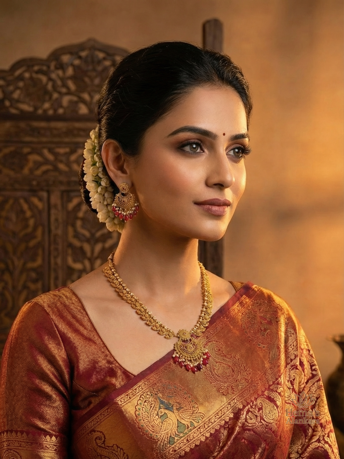 Elevate your traditional look with the Floral Motif Pendant Necklace Set by Hemas Alankara. Crafted in an elegant antique gold finish, this short necklace features finely detailed floral motifs embedded with white stones and highlighted by a beautifully designed central pendant.